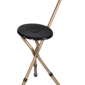 Provides a comfortable seat to rest on when open, and a sturdy support cane when closed (Figure A) Manufactured with sturdy, extruded aluminum tubing Tripod design with vinyl contoured tipped legs 9″ diameter seat.