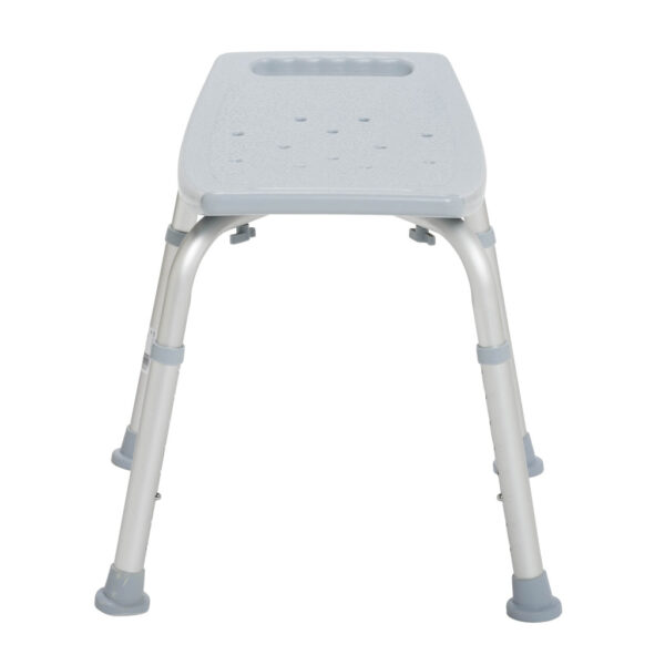 Tool-free assembly of seat and legs (Figure A) Drainage holes in bench reduce slipping Aluminum fame is lightweight, durable and corrosion proof Legs are height adjustable in 1″ increments, and angled with suction-style tips to provide additional stability.