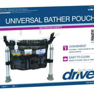 Universal pouch for bath & shower chairs and benches Mesh pocket to securely hold personal items soap, shampoo, etc Easy-to-clean nylon.